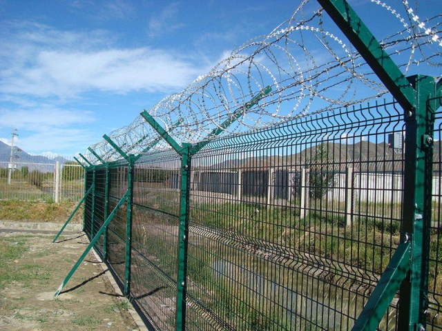 機場護欄網又稱作“Y型安全防御護網”,由Y型支架立拄,加強型焊接網,安全防盜連接件和熱鍍鋅刀片刺網組成,是強度和安全防御性級別很高的圍界護欄網產品。被廣泛應用在機場、軍事基地等高安全場所。機場護欄網的突出特點就是美觀實用、安全性高、防攀爬能力好,網體連接方式采用特制SBS緊扣件,有效防止人為的破壞性拆卸,橫向四道折彎加強筋,使網面強度顯著增加。